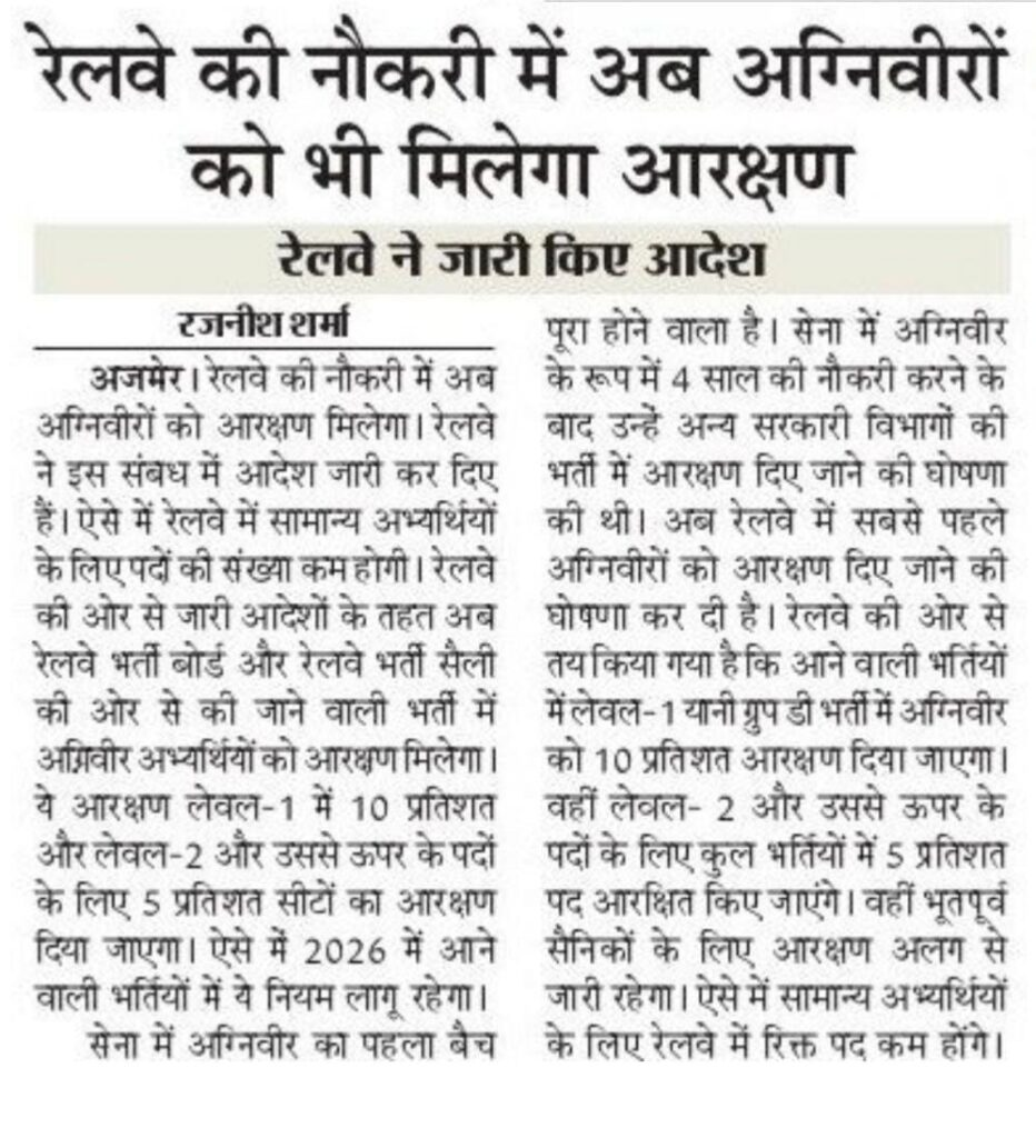 अग्निपथ योजना 2026 ने भारतीय सशस्त्र बलों में भर्ती की प्रक्रिया में क्रांतिकारी बदलाव लाया है और युवाओं को चार साल की संक्षिप्त सेवा के दौरान अनुभव और अनुशासन प्रदान किया है। पहले बैच के आगामी सेवानिवृत्ति के साथ, पूर्व-अग्निवीरों के लिए रोजगार और पुनर्वास सुनिश्चित करना एक महत्वपूर्ण राष्ट्रीय प्राथमिकता बन गया है।केंद्र और राज्य सरकारों द्वारा लागू किए गए विशेष आरक्षण कोटे — चाहे वह CAPFs, भारतीय रेलवे, रक्षा PSU या राज्य पुलिस सेवाएँ हों — पूर्व-अग्निवीरों को सुरक्षित और सम्मानजनक कैरियर विकल्प प्रदान करने के लिए तैयार किए गए हैं। ये पहल न केवल उनके सैन्य प्रशिक्षण और कौशल का लाभ उठाती हैं, बल्कि भारत की सुरक्षा, प्रशासन और औद्योगिक विकास को भी मजबूत करती हैं।अंततः, अग्निवीरों का सफल पुनर्वास और रोजगार सुनिश्चित करना सिर्फ व्यक्तिगत लाभ नहीं, बल्कि राष्ट्रीय हित और सामरिक क्षमता को बढ़ाने वाला कदम है।
