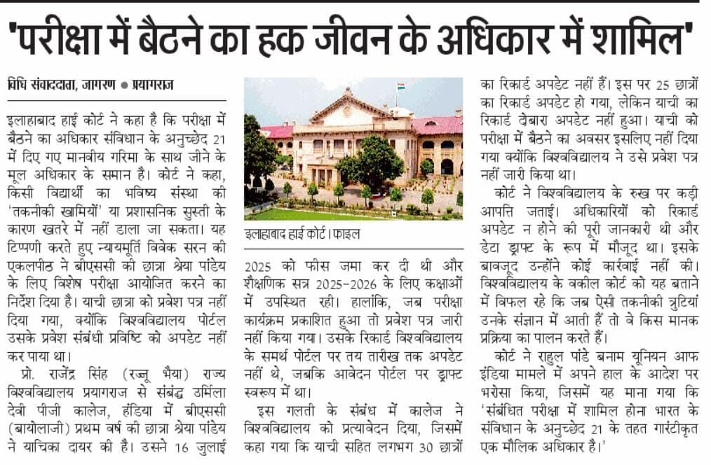 शिक्षा किसी भी व्यक्ति के जीवन का सबसे महत्वपूर्ण आधार है। यही माध्यम है जिसके द्वारा व्यक्ति अपने सपनों को साकार करता है और समाज में प्रतिष्ठित स्थान हासिल करता है। हालांकि, तकनीकी त्रुटियाँ, प्रशासनिक लापरवाही या रिकॉर्ड अपडेट न होने जैसी छोटी-छोटी समस्याओं के कारण अक्सर छात्रों का भविष्य खतरे में पड़ जाता है। इसी तरह के एक मामले में, इलाहाबाद हाईकोर्ट (Allahabad High Court) ने ऐतिहासिक निर्णय देते हुए स्पष्ट किया कि “परीक्षा में बैठने का अधिकार संविधान के अनुच्छेद 21 के तहत जीवन के अधिकार का हिस्सा है।” यह फैसला न केवल व्यक्तिगत छात्र के लिए बल्कि पूरे शिक्षा तंत्र और लाखों छात्रों के लिए एक महत्वपूर्ण मील का पत्थर साबित हो रहा है।