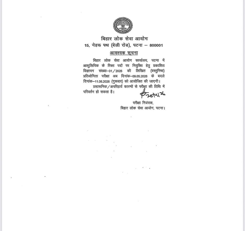 BPSC Stenographer भर्ती 2026 की संशोधित परीक्षा तिथि 11 जून 2026 निर्धारित की गई है।