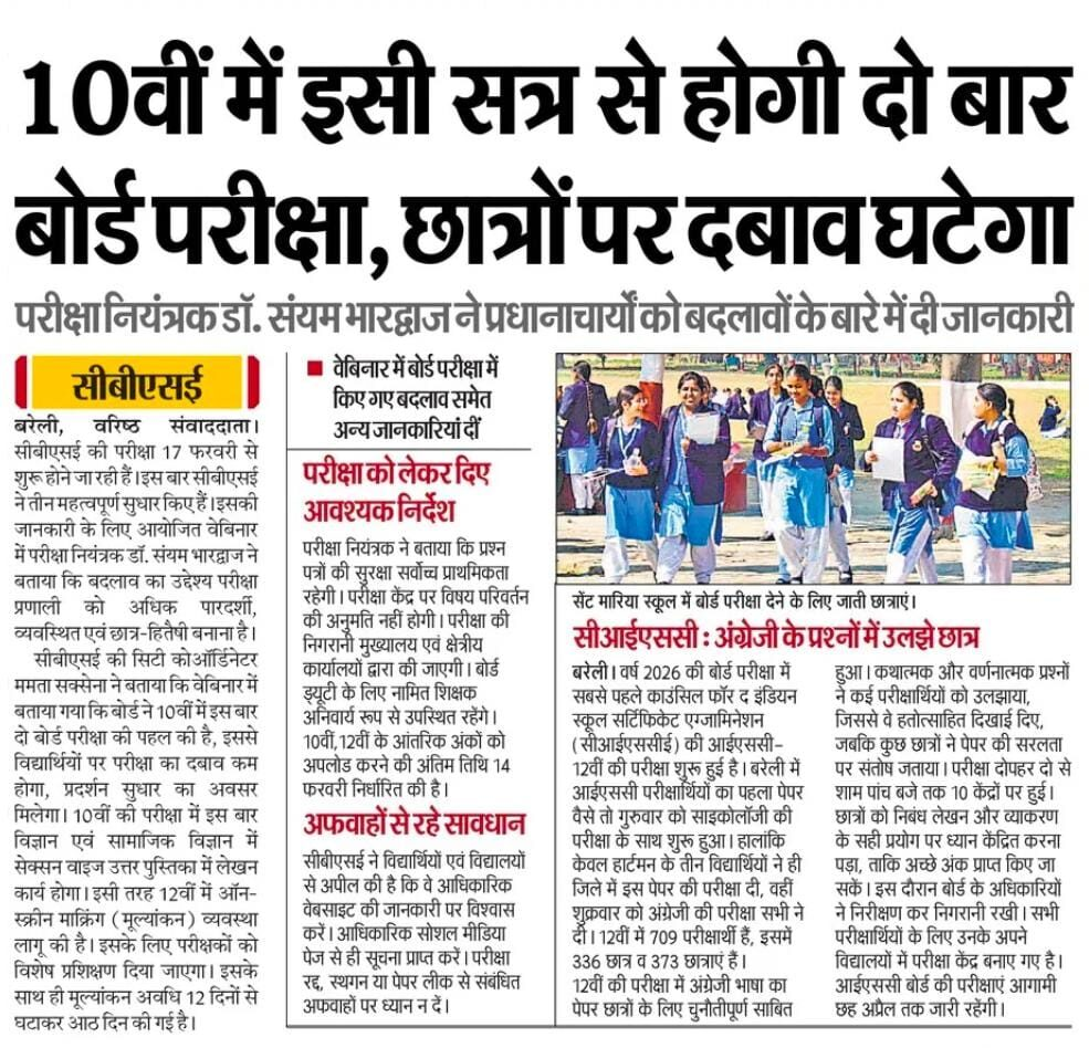 सीबीएसई (CBSE) की बोर्ड परीक्षा 17 फरवरी 2026 से शुरू होने जा रही है। इस बार बोर्ड ने परीक्षा प्रणाली में तीन महत्वपूर्ण सुधार किए हैं, जिनका उद्देश्य परीक्षा प्रक्रिया को अधिक पारदर्शी, व्यवस्थित और छात्र-केंद्रित बनाना है।परीक्षा नियंत्रक डॉ. संयम भारद्वाज ने आयोजित वेबिनार में बताया कि ये बदलाव छात्रों के हित को ध्यान में रखते हुए किए गए हैं। सीबीएसई की सिटी को-ऑर्डिनेटर ममता सक्सेना ने कहा कि 10वीं कक्षा में दो बोर्ड परीक्षा कराने की नई पहल की गई है, जिससे छात्रों पर परीक्षा का दबाव कम होगा और प्रदर्शन सुधार का अवसर मिलेगा।