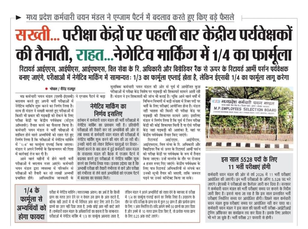 यह रहा आपके पैराग्राफ का मानव-स्तर पर प्रोफेशनल, स्पष्ट और न्यूज़-स्टाइल में री-राइट किया हुआ संस्करण:यह परिवर्तन केवल एक तकनीकी संशोधन नहीं है, बल्कि परीक्षा प्रणाली को अधिक सुरक्षित (Secure), विश्वसनीय (Reliable) और अभ्यर्थियों के लिए संतुलित (Balanced) बनाने की दिशा में उठाया गया एक ठोस और दूरदर्शी कदम है। बीते कुछ वर्षों में देशभर की विभिन्न प्रतियोगी परीक्षाओं में गड़बड़ी, पेपर लीक और परीक्षा केंद्रों पर अनियमितताओं की घटनाएँ सामने आती रही हैं। ऐसे परिदृश्य में Madhya Pradesh Employees Selection Board का यह निर्णय इस बात का संकेत है कि बोर्ड अब परीक्षा प्रक्रिया को और अधिक कठोर, पारदर्शी और नियंत्रित बनाने के लिए प्रतिबद्ध है।इसके साथ ही, 1/4 नेगेटिव मार्किंग नियम लागू होने से अभ्यर्थियों को आंशिक राहत भी मिलेगी। इससे छात्रों पर अनावश्यक परीक्षा दबाव (Exam Pressure) कम होगा और वे अधिक प्रभावी रणनीति के साथ प्रश्नों को हल कर सकेंगे, जिससे प्रदर्शन में भी सुधार की संभावना बढ़ेगी।