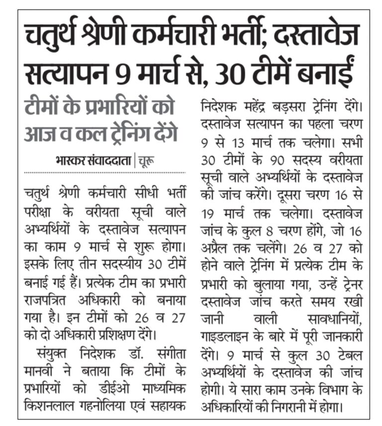 राजस्थान में चतुर्थ श्रेणी कर्मचारी (4th Grade Employee) भर्ती प्रक्रिया का अगला महत्वपूर्ण चरण जल्द ही शुरू होने वाला है। Direct Recruitment के तहत चयनित अभ्यर्थियों के लिए Document Verification (दस्तावेज सत्यापन) 9 मार्च से आरंभ होगी। यह चरण Final Selection से पहले सबसे अहम माना जाता है, क्योंकि इसी में अभ्यर्थियों के शैक्षणिक, जाति, निवास और अन्य आवश्यक प्रमाण पत्रों की जाँच की जाती है।सरकारी विभाग ने इस प्रक्रिया को व्यवस्थित और पारदर्शी बनाने के लिए 30 Teams का गठन किया है। प्रत्येक टीम में तीन सदस्य होंगे और एक Gazetted Officer को टीम का प्रभारी बनाया गया है। अभ्यर्थियों के लिए यह जरूरी है कि वे अपने सभी Original Documents और Self-Attested Copies समय पर तैयार रखें।
