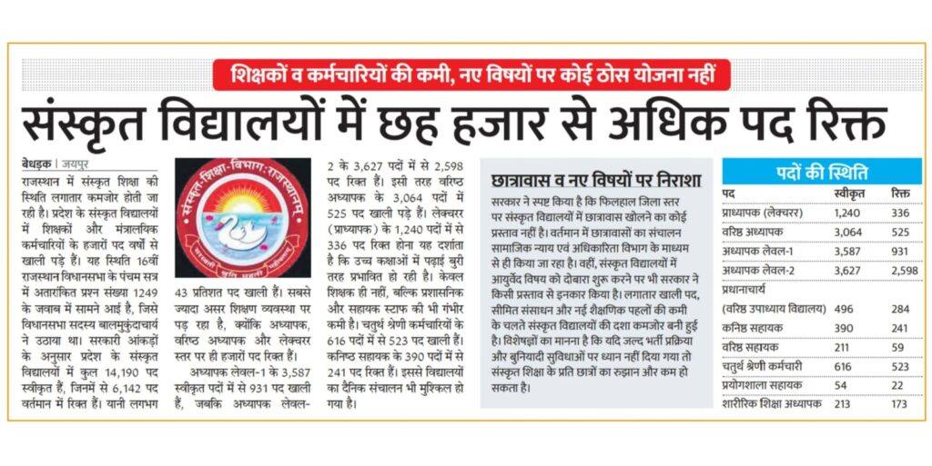 राजस्थान के संस्कृत विद्यालयों में शिक्षकों और सहायक स्टाफ की भारी कमी राज्य की शिक्षा व्यवस्था के लिए एक गंभीर चेतावनी है। कुल स्वीकृत पदों का बड़ा हिस्सा वर्षों से खाली पड़ा होना न केवल प्रशासनिक उदासीनता को दर्शाता है, बल्कि यह भी संकेत देता है कि जमीनी स्तर पर शिक्षा प्रणाली लगातार कमजोर हो रही है। विशेष रूप से अध्यापन और सहायक सेवाओं से जुड़े पदों की उच्च रिक्ति दर ने विद्यालयों के नियमित संचालन और शैक्षणिक गुणवत्ता दोनों को प्रभावित किया है।इसके साथ ही, छात्रावासों की सीमित व्यवस्था, नए शैक्षणिक विषयों की अनुपस्थिति और संसाधनों की कमी ने संस्कृत शिक्षा को आधुनिक प्रतिस्पर्धा में पीछे धकेल दिया है। यदि समय रहते प्रभावी भर्ती प्रक्रिया, संरचनात्मक सुधार और संसाधन विकास पर ध्यान नहीं दिया गया, तो आने वाले वर्षों में संस्कृत शिक्षा के प्रति छात्रों की रुचि और विश्वास दोनों में गिरावट देखी जा सकती है।अतः यह आवश्यक है कि सरकार इस मुद्दे को केवल प्रशासनिक आंकड़ों के रूप में न देखकर एक प्राथमिक शिक्षा सुधार के रूप में संबोधित करे, ताकि राजस्थान की समृद्ध सांस्कृतिक और भाषाई विरासत को सुरक्षित और सशक्त रूप में आगे बढ़ाया जा सके।