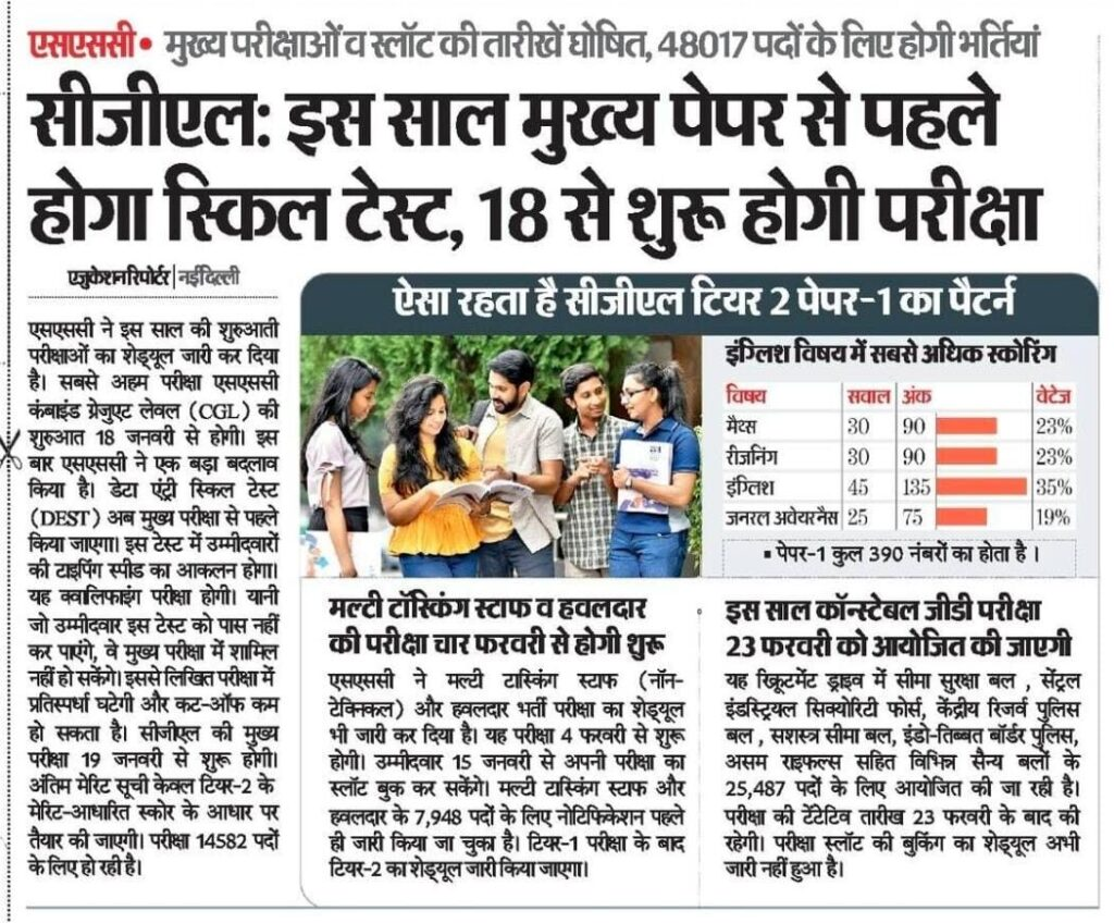 Staff Selection Commission (SSC) की तैयारी कर रहे लाखों उम्मीदवारों के लिए बड़ी खबर सामने आई है। SSC ने इस साल की महत्वपूर्ण परीक्षाओं का अद्यतन शेड्यूल जारी किया है। इस वर्ष कुल 48,017 पदों पर भर्तियां की जाएंगी, जिनमें CGL, MTS, हवलदार और कांस्टेबल GD जैसी प्रमुख परीक्षाएं शामिल हैं।विशेष रूप से, SSC ने CGL (Combined Graduate Level) परीक्षा के शेड्यूल में एक महत्वपूर्ण और ऐतिहासिक बदलाव किया है, जो उम्मीदवारों की तैयारी और रणनीति पर सीधे असर डाल सकता है।