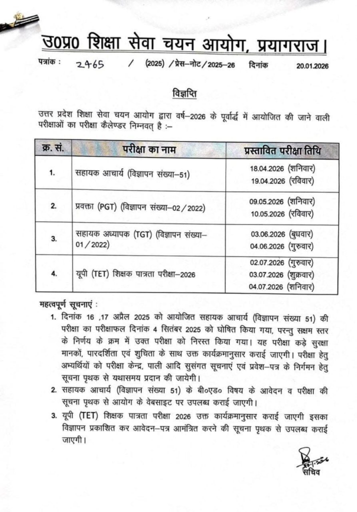 Assistant Professor (Advt. No. 51) की पहले आयोजित परीक्षा रद्द कर दी गई थी। अब यह परीक्षा नई परीक्षा शेड्यूल के अनुसार आयोजित की जाएगी।परीक्षा से संबंधित सिटी, एडमिट कार्ड और परीक्षा केंद्र की जानकारी अलग से आधिकारिक वेबसाइट पर जारी की जाएगीAssistant Professor के B.Ed विषय-वार (Subject-wise) विवरण, आवेदन और परीक्षा संबंधी जानकारी भी अलग से आधिकारिक वेबसाइट पर उपलब्ध होगी।UPTET 2026 का डिटेल्ड नोटिफिकेशन, ऑनलाइन आवेदन प्रक्रिया और परीक्षा से जुड़ी पूरी जानकारी बाद में जारी की जाएगी।