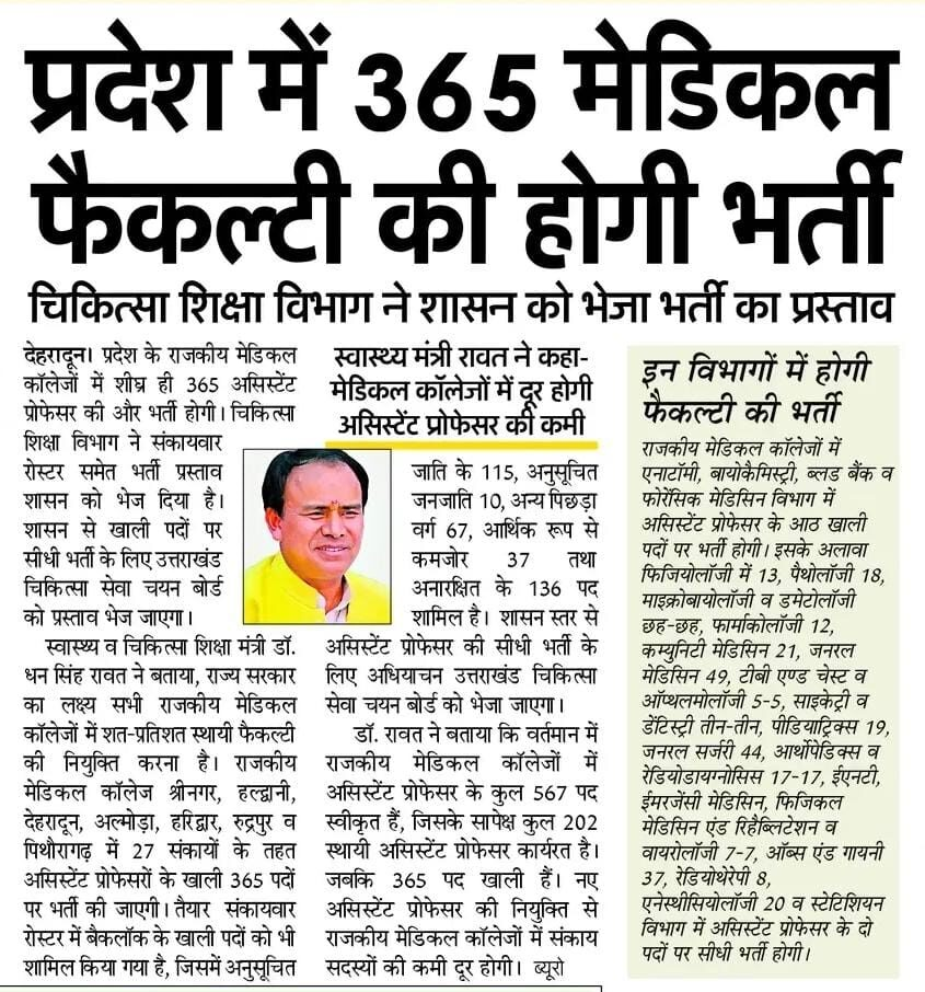 स्वास्थ्य एवं चिकित्सा शिक्षा मंत्री डा. धन सिंह रावत ने बताया है कि राज्य सरकार का मुख्य उद्देश्य है कि सभी राजकीय मेडिकल कॉलेजों में 100% स्थायी फैकल्टी की नियुक्ति की जाए। वर्तमान में कई मेडिकल कॉलेजों में असिस्टेंट प्रोफेसर के पद खाली हैं, जिससे न केवल मेडिकल छात्रों की शिक्षा प्रभावित हो रही है, बल्कि मरीजों को मिलने वाली चिकित्सा सेवाओं पर भी असर पड़ रहा है।